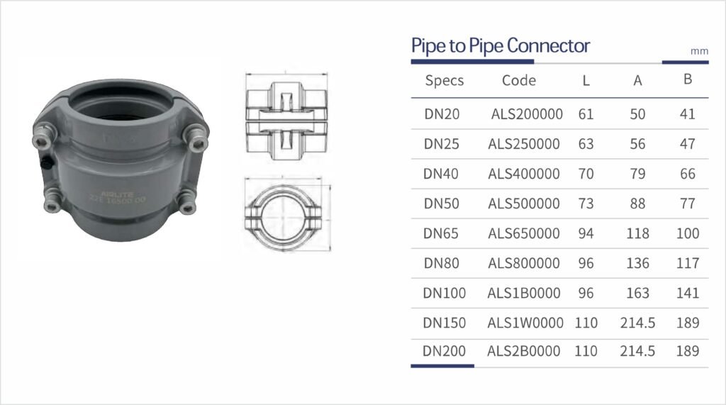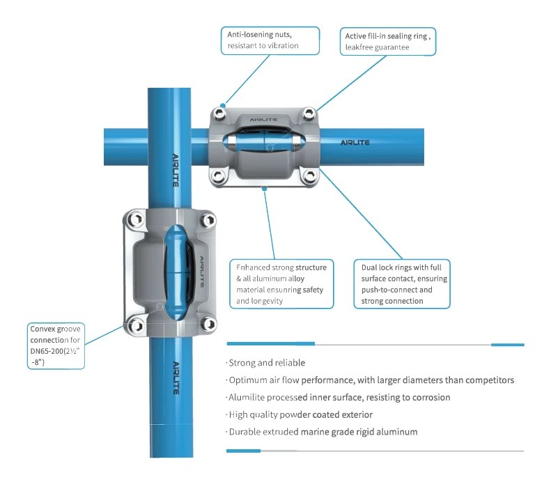 AirLite aluminum air piping system suits for compressed air, vacuum, and inert gas, etc. AirLite air pipe system ranges from 20mm (3/4″) to 200mm (8″) to integrate your project without compromising performance. Through its reliable leak-free design and durable corrosion-resistant material, AirLite aluminum air piping system consistently provides clean and quality air sources, guarantee total cost saving and optimization of your air system and production efficiency.
